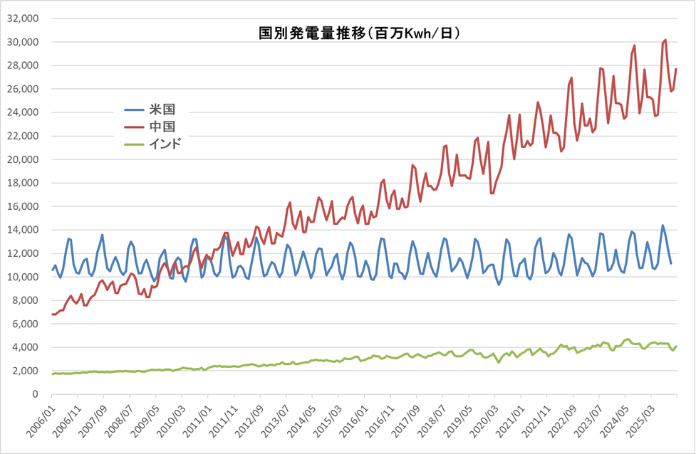 (2026年1月27日更新)米国EIA、中国国家統計局、インド電力省のデータによる。